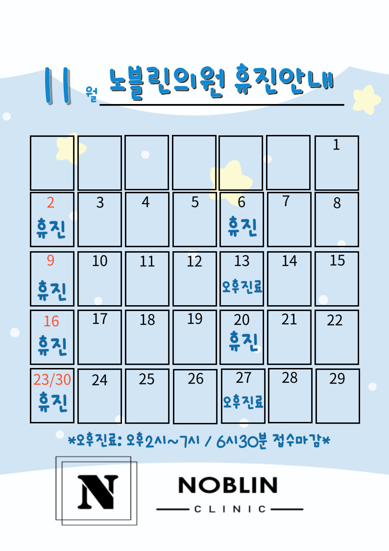 11월은 일요일 휴진입니다. 목요일은 격주 진료로 오후 2시부터 7시까지 진료입니다.
